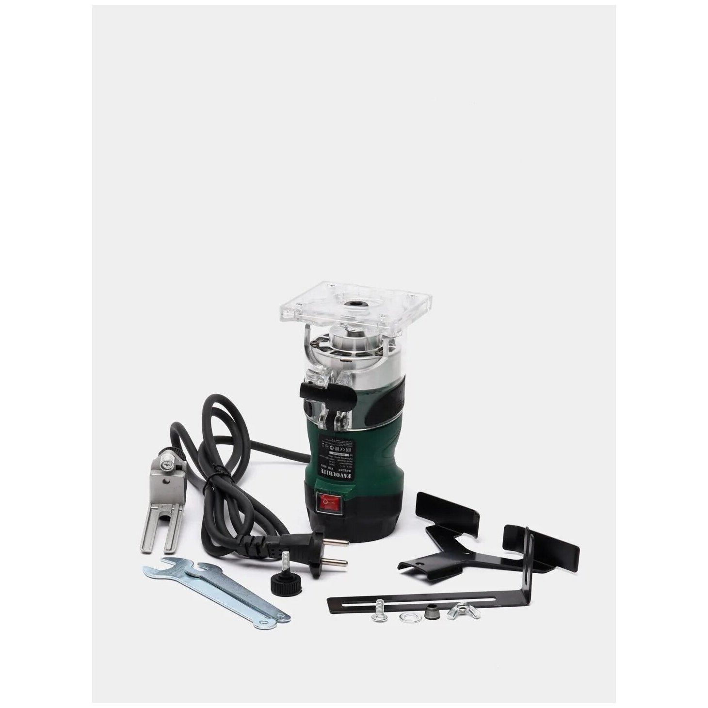 Электрический фрезер, Линейка-упор, 2 ключа, Обводной ролик, Комплект угольных щеток, Упаковка