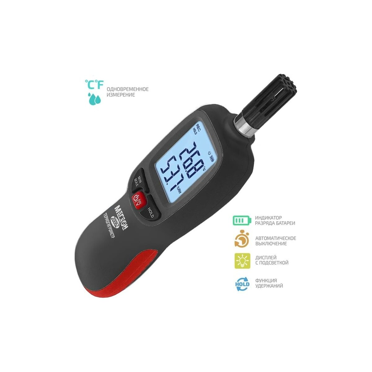 МЕГЕОН 20062 – новинка в модельном ряду цифровых высокочувствительных термогигрометров. Представленный прибор предназначен для быстрого определения параметров температуры и влажности с высокой точностью в помещениях и на открытом пространстве. Помимо этого с его помощью можно определить точку росы, снять показания влажного термометра, а также зафиксировать максимальные и минимальные значения измеренных данных. Преимуществом также является функция записи результатов в память ёмкостью 999 ячеек. Измеритель получил современный дизайн и компактные размеры. Модель имеет эргономичную форму корпуса, удобное расположение органов управления на передней панели и большой ЖК- дисплей с яркой светодиодной подсветкой. На заднее стенке предусмотрено монтажное отверстие для установки на штатив, благодаря чему достигается максимальное удобство при эксплуатации.