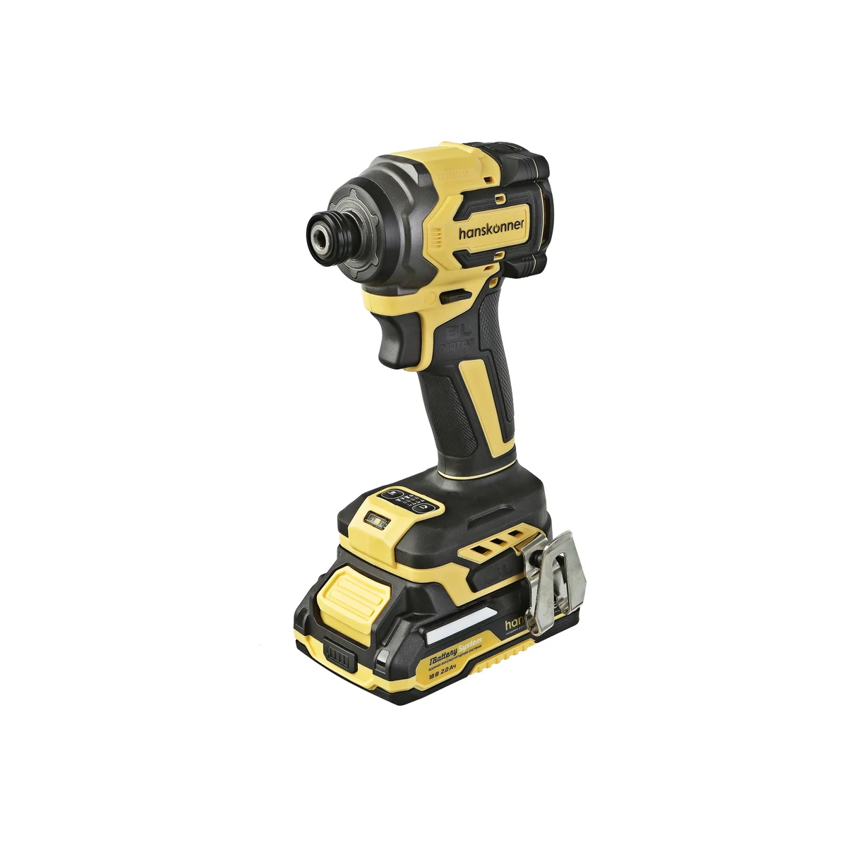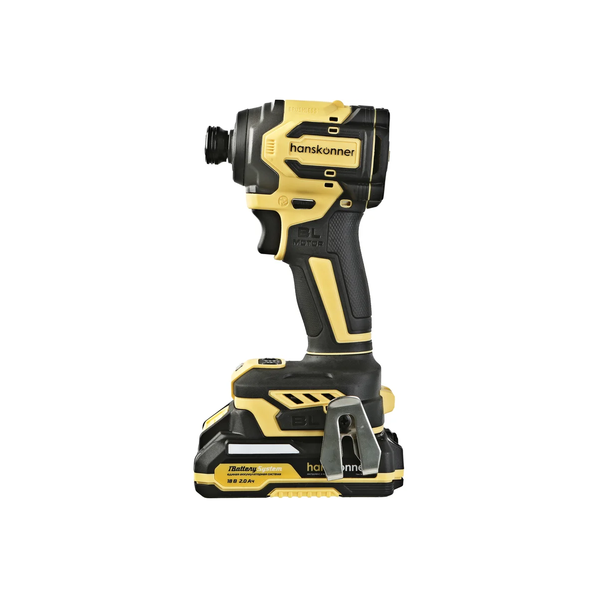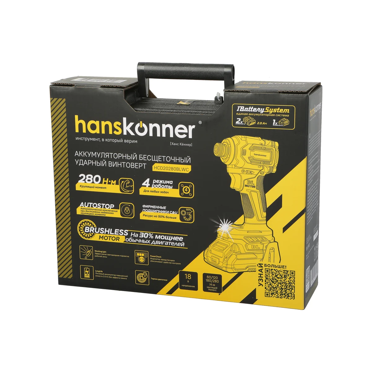 Hanskonner HCD20280BLWC–аккумуляторный 18 В, ударный винтоверт с типом гнезда под шестигранник 1/4″– является частью системы 1BatterySystem, обеспечивающей совместимость одного и того же аккумулятора с целым рядом наименований инструмента. Модель обладает максимально сбалансированной компоновкой: небольшие размеры корпуса и рукояти позволяют эффективное использование в условиях с затрудненным доступом, а нейтральный центр тяжести, и обилие прорезиненных противоскользящих поверхностей способствуют надежному хвату, и лучшему контролю. Винтоверт оснащен 18 В бесщеточным двигателем, характеризующимся на 30% лучшей производительностью в сравнении с коллекторными аналогами.