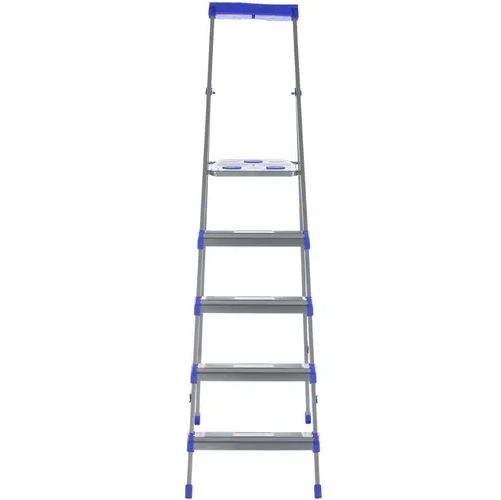 Стремянка имеет 5 ступеней, поэтому вы с легкостью сможете выбрать нужную вам рабочую высоту. Высота последней ступени значительна: она равна 107 см. Одним из преимуществ стремянки является наличие конструктивных элементов, препятствующих скольжению ног. Масса стремянки сравнительно невелика: она равна 6.7 кг.