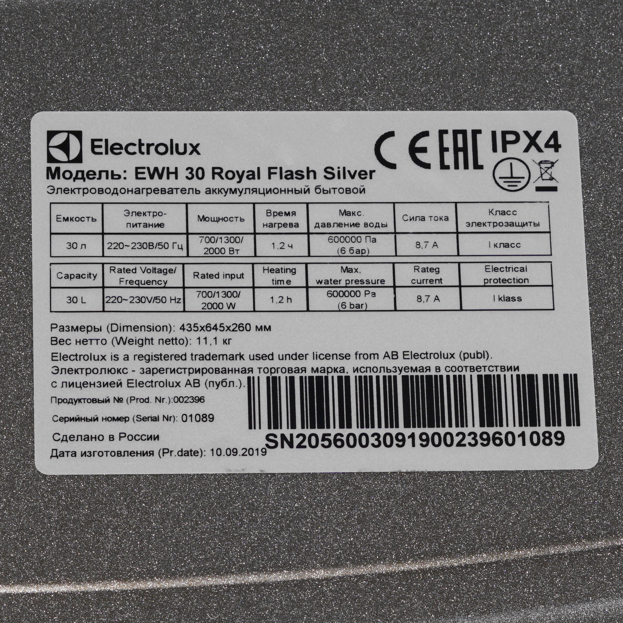 —Electrolux EWH 30 Royal Flash Silver