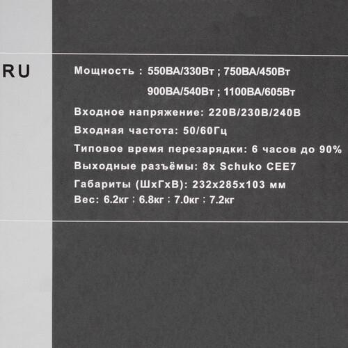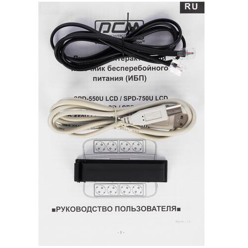 Powercom Spider SPD-550U LCD представлен в горизонтальном исполнении ‒ в форм-факторе Brick. Такой корпус удобен для подключения потребителей. Для этого используются 8 евророзеток CEE 7. Для взаимодействия с устройствами модель использует интерфейс USB. При коротком замыкании и перегрузки аппарата срабатывает автоматический выключатель. Он не позволяет ИБП выйти из строя.