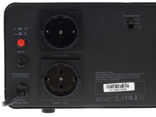 ИБП SVEN RT-1000 имеет несколько разъемов по типу евророзетки, а также встроенные клеммы для подключения АКБ. Устройство оснащено несколькими системами контроля его исправной работы, в том числе самодиагностикой при включении. Информация о режиме работы источника бесперебойного питания отображается на небольшом дисплее, расположенном на корпусе.
