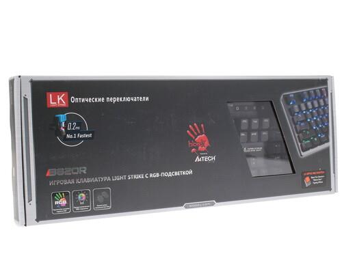 104-клавишная клавиатура A4Tech Bloody B820R станет великолепным выбором для любителей компьютерных игр. Модель оборудована оптическими переключателями, и обеспечивает низкое время отклика: оно равно 0.2 мс. Особенностью устройства является настраиваемая RGB-подсветка. Производителем предусмотрены начальные настройки подсветки.