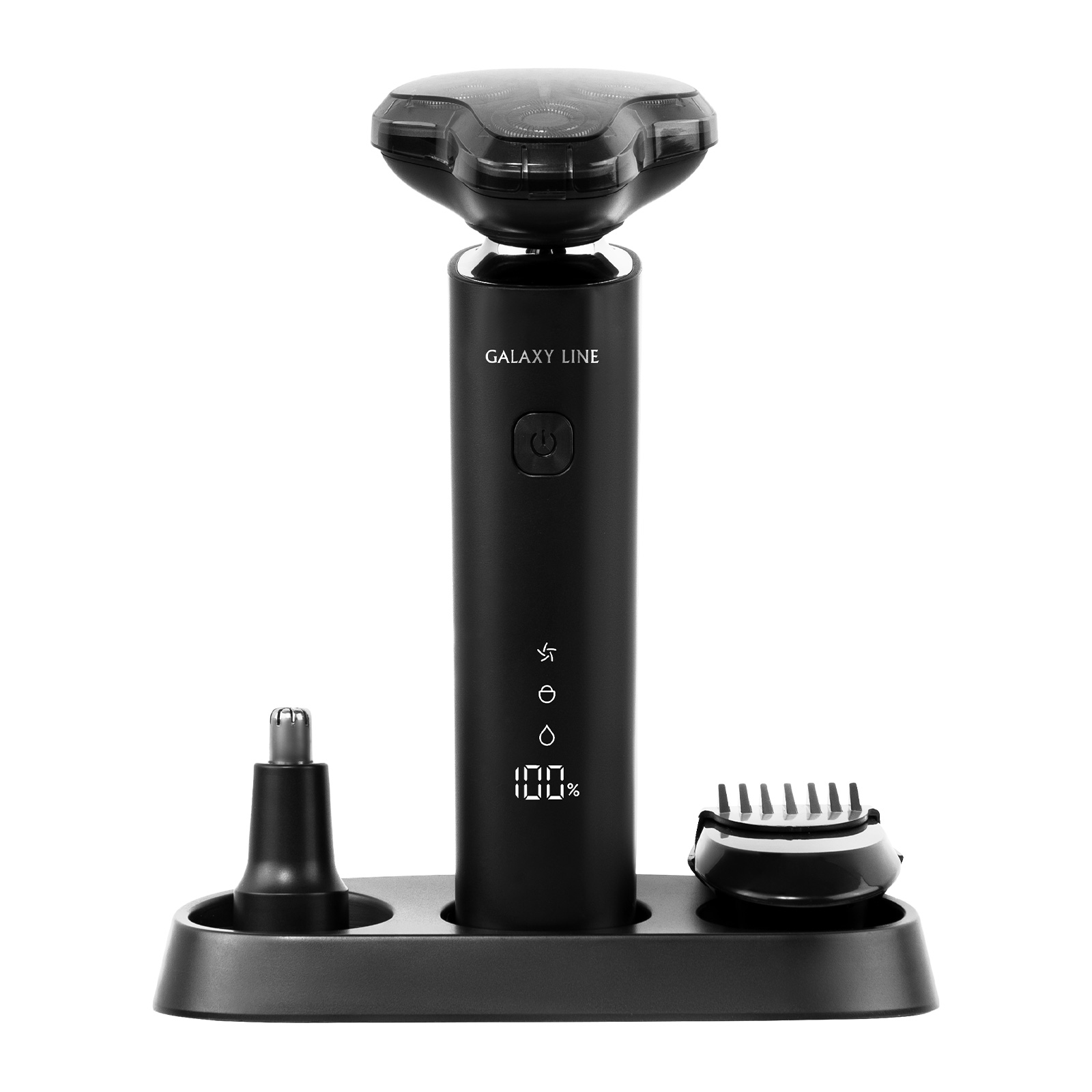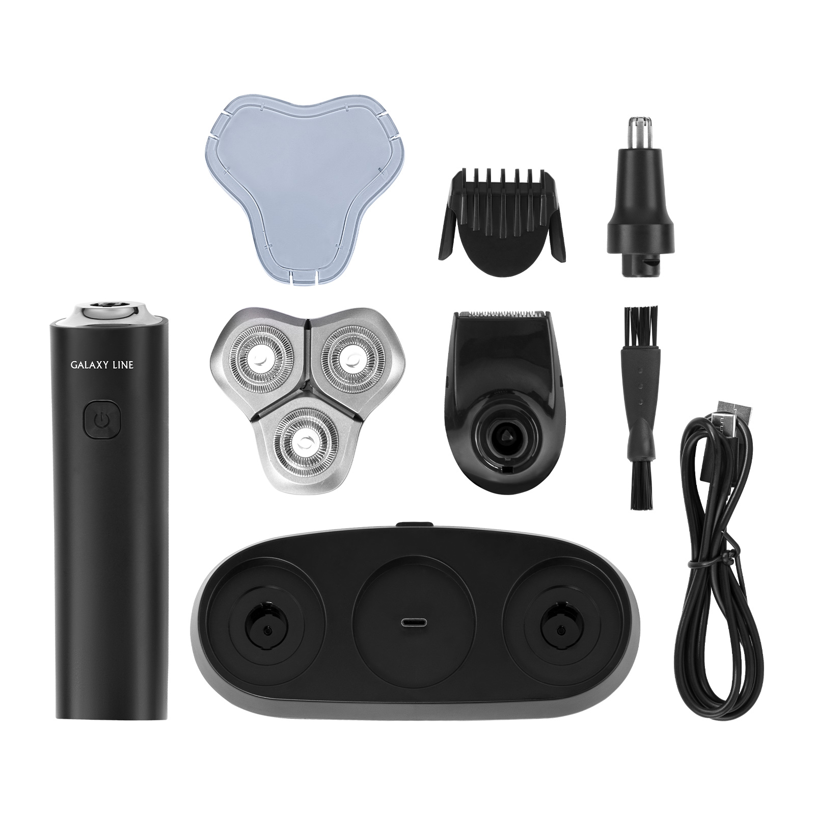 В комплекте: Щётка для очистки 1 шт., Защитный колпачок 1 шт., USB-кабель 1 шт., Насадка-триммер для носа 1 шт., Насадка-триммер для висков, бороды и усов 1 шт., Подставка для зарядки 1 шт., Руководство по эксплуатации 1 экз., Потребительская тара 1 шт.