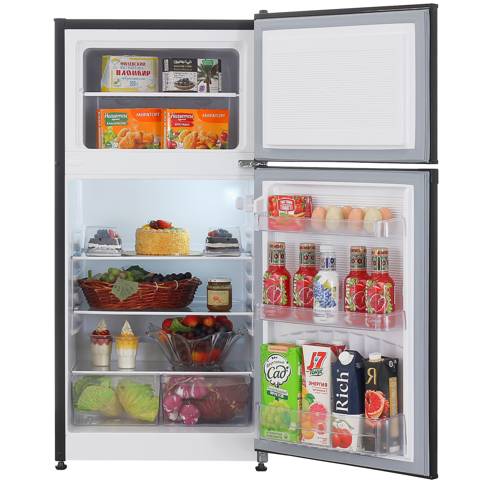 Nordfrost NRT 143 232 имеет стильный черный матовый корпус, который легко впишется в любой интерьер. Горизонтальная скрытая дверная ручка добавляет элегантности. Внутри холодильника расположены 3 полки и 2 ящика в холодильной камере, а также 2 ящика в морозильной камере.