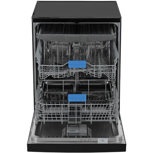 Beko BDFN25521B имеет ширину 60 см. Три корзины позволяют разместить до 15 комплектов посуды за один раз. Верхняя корзина регулируется по высоте. Это удобно для размещения крупногабаритных предметов.