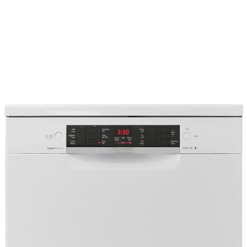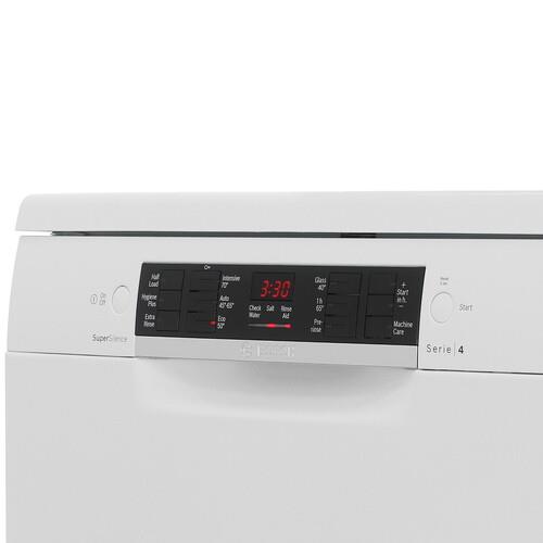Bosch SMS46NW01B выполнена в классическом **белом цвете**. Она гармонично впишется в любой интерьер. Панель управления – открытая, с удобными кнопками и информативным дисплеем.