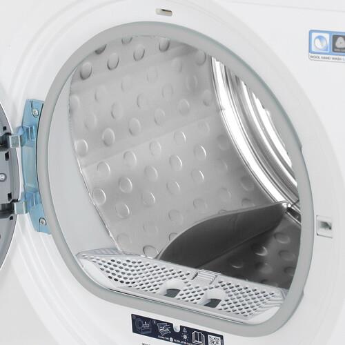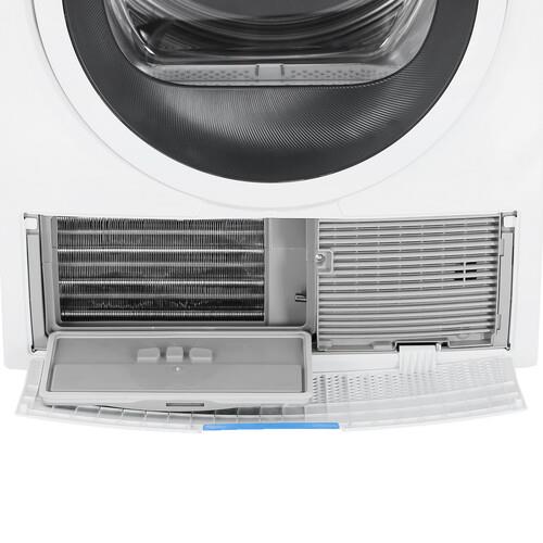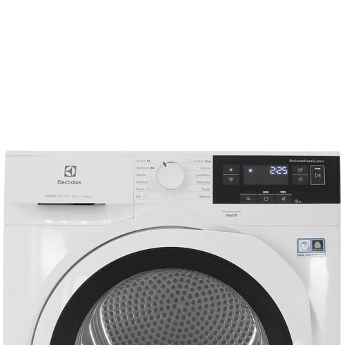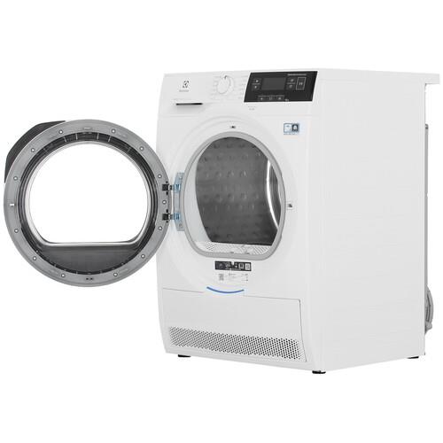 Electrolux EW8H358S подключается к сети через 1.45-метровый кабель. Инверторный двигатель уменьшает расходы на электричество и уровень издаваемого шума. Рассчитанная на 20 ч функция отсрочки старта запускает работу устройства в установленный временной интервал. Уровень влажности определяется автоматически для выбора подходящих параметров сушки. Индикатор оповещает о необходимости очистить фильтр. Подсветка добавляет удобства при загрузке и разгрузке барабана.