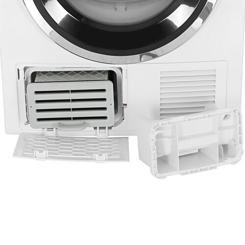 Встроенный датчик влажности определяет влажность белья, позволяя электронике настраивать время сушки. Это также зависит от количества белья в барабане. Блокировка панели управления не допустит случайного включения машины и защитит от изменения настроек.