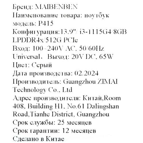 Ноутбук MAIBENBEN P415 облачен в корпус из алюминиевого сплава с анодированным покрытием и высокоточной обработкой с ЧПУ для дополнительной коррозийной и износостойкости. 2-ядерный процессор Intel Core i3-1115G4 и 8 ГБ интегрированной оперативной памяти позволят устройству справляться с базовой работой за компьютером. Литий-полимерный аккумулятор емкостью 5000 мАч позволит компьютеру автономно проработать до 10 часов в режиме воспроизведения локальных видео 4K при максимальной яркости.