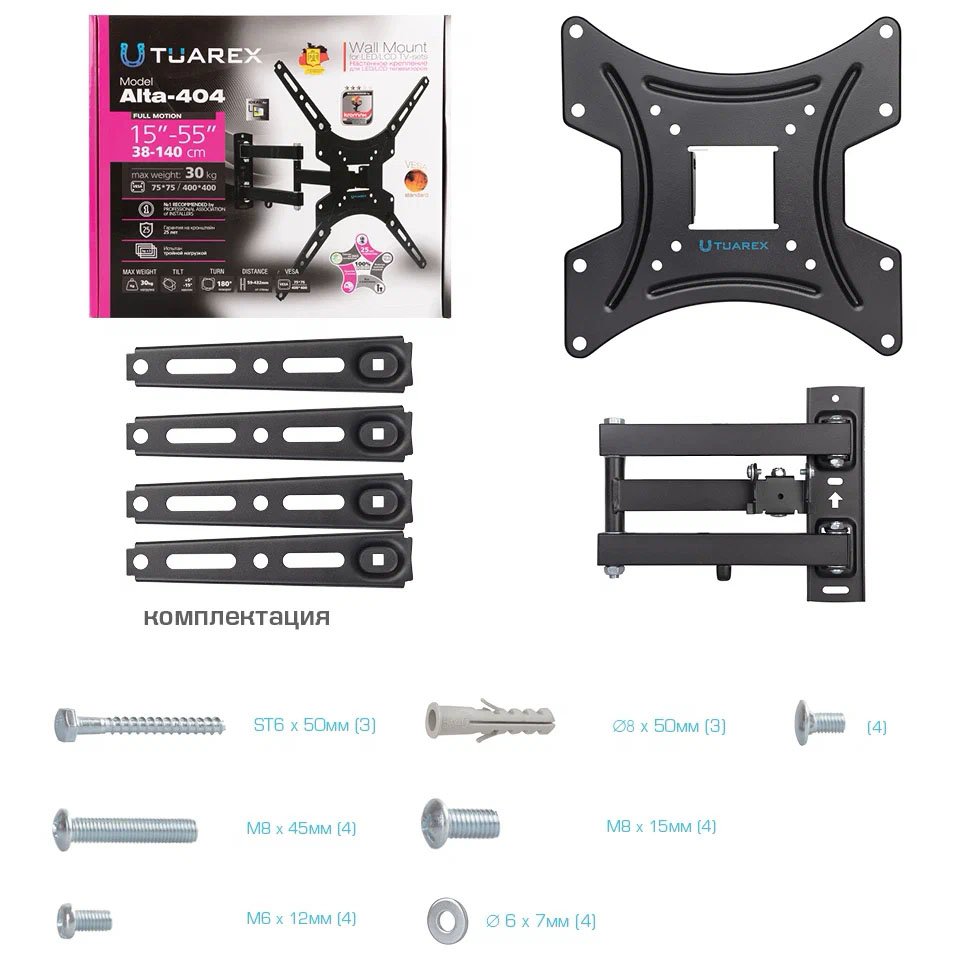 Дополнительная информация: декоративные накладки, кабель-канал; расстояние от стены 59-432 мм; угол наклона +5 -15°; угол поворота 180°; вращение экрана ±3°