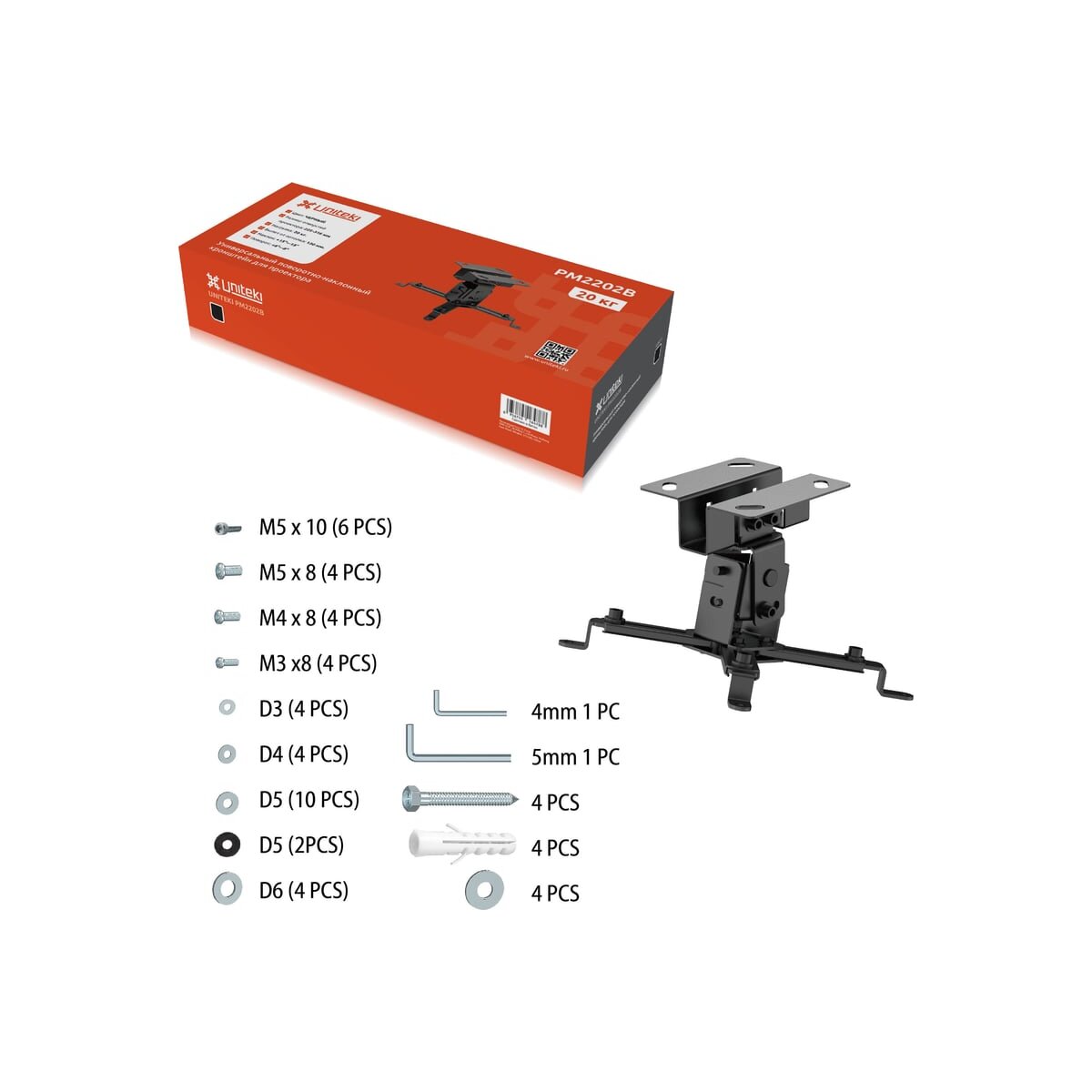 Кронштейн поставляется в оригинальной упаковке, с подробной инструкцией и широким набором креплений для потолочной инсталляции.