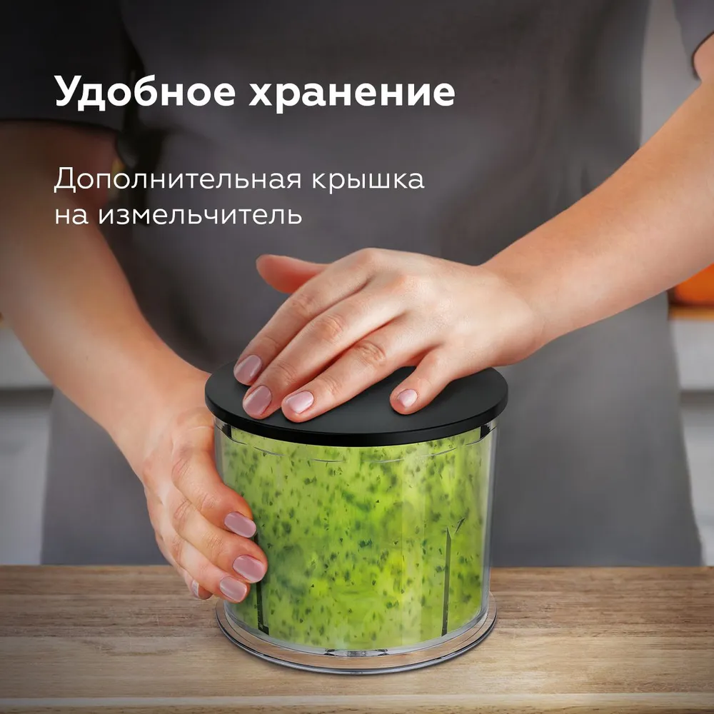 Блендер, насадка-блендер, насадка-венчик, мерный стакан, чаша измельчителя с крышкой, зарядный кабель USB Type-C, руководство по эксплуатации, гарантийный талон
