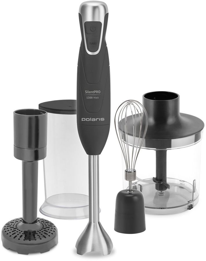 тип: погружной, мощность: 1300Вт, скоростей/режимов 2, турборежим, рабочая поверхность нержавеющая сталь, измельчитель, венчик для взбивания, защита от перегрузки, цвет: серый