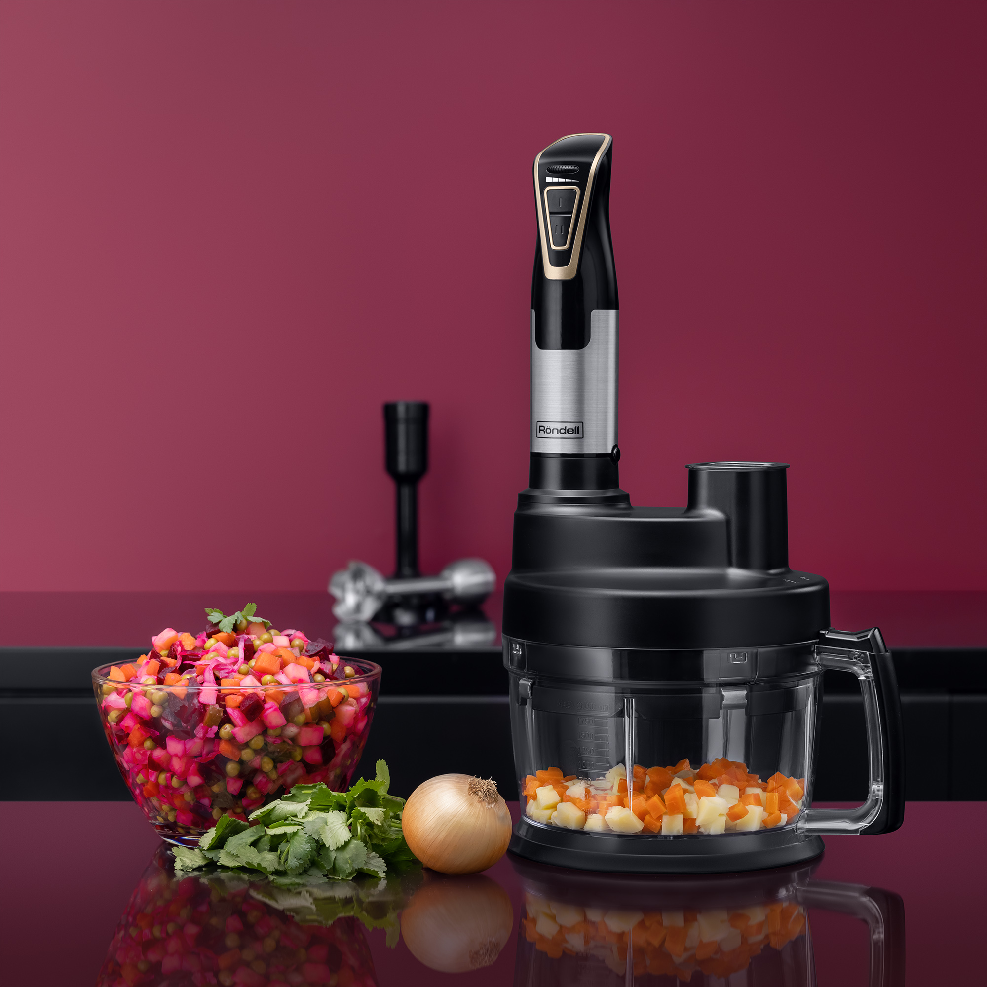 Он предлагает два скоростных режима, а также TURBO режим для ускоренного процесса измельчения. Большая чаша измельчителя объемом 2000 мл позволяет обрабатывать большие порции продуктов, а функции нарезки кубиками и терки добавляют удобства в приготовлении самых разнообразных блюд.