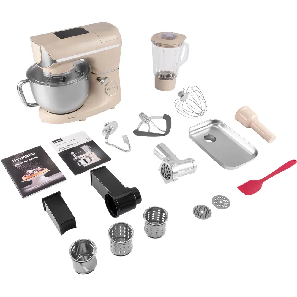 кухонная машина чаша; защитная крышка для чаши; насадка-венчик; насадка-крюк; насадка-лопатка; насадка-блендер; насадка-мясорубка; 3 диска для фраша; насадка-овощерезка; книга рецептов; инструкция с гарантийным талоном