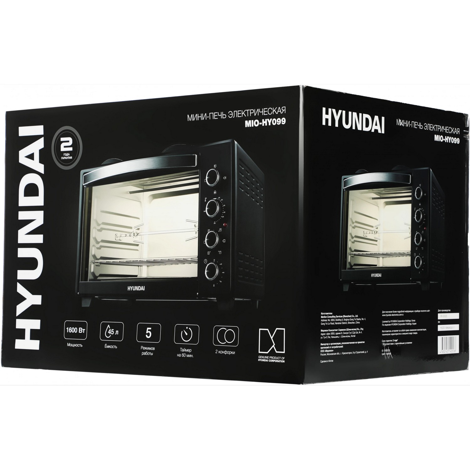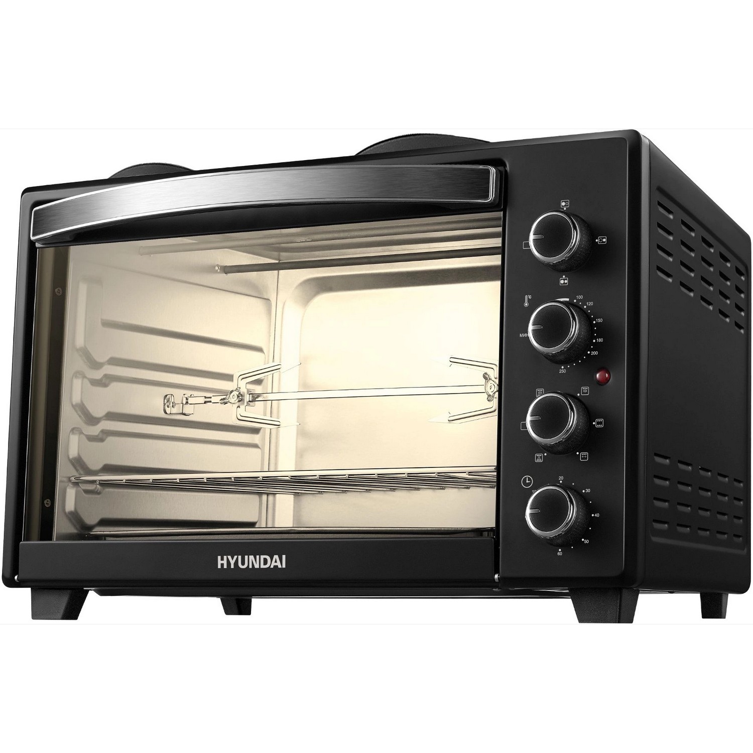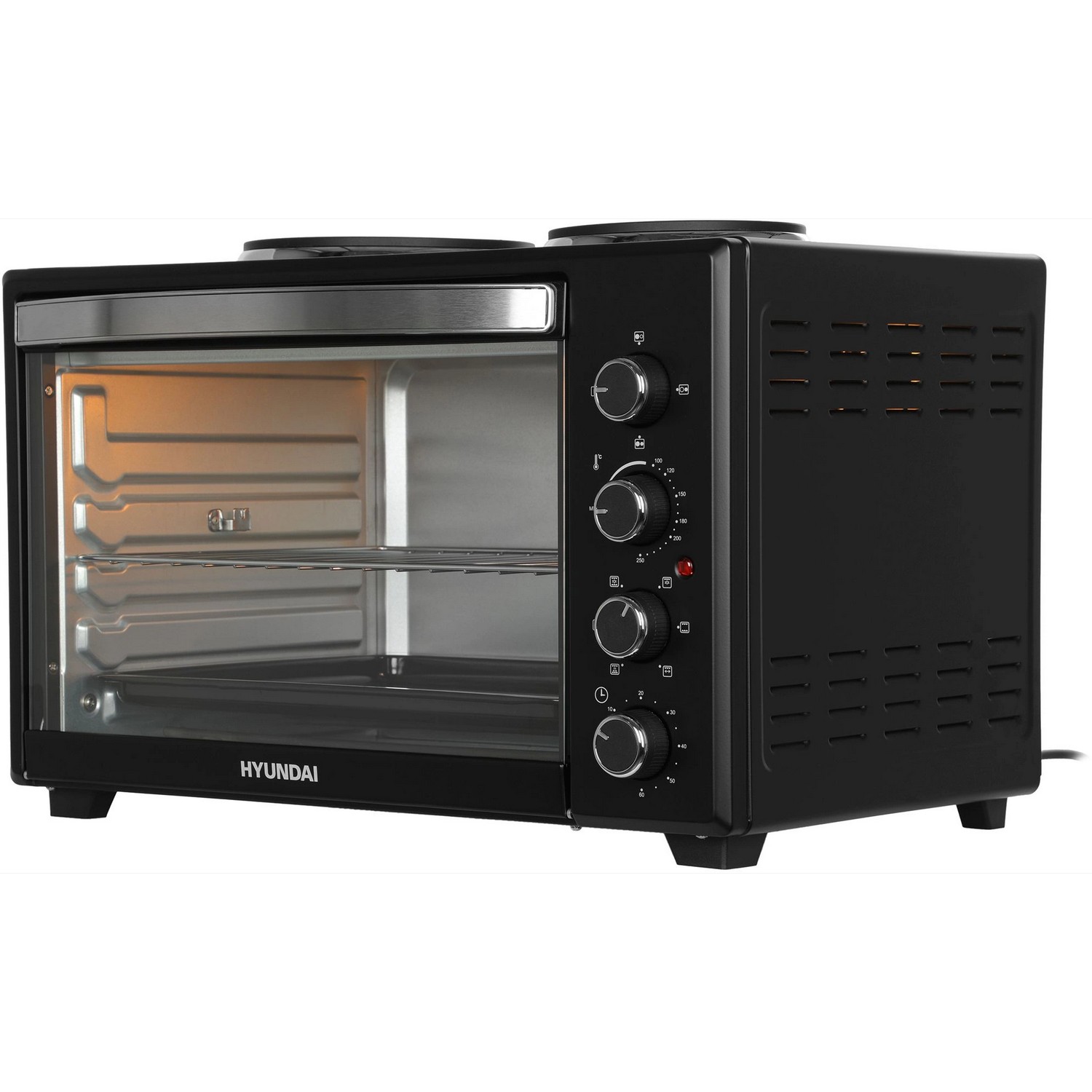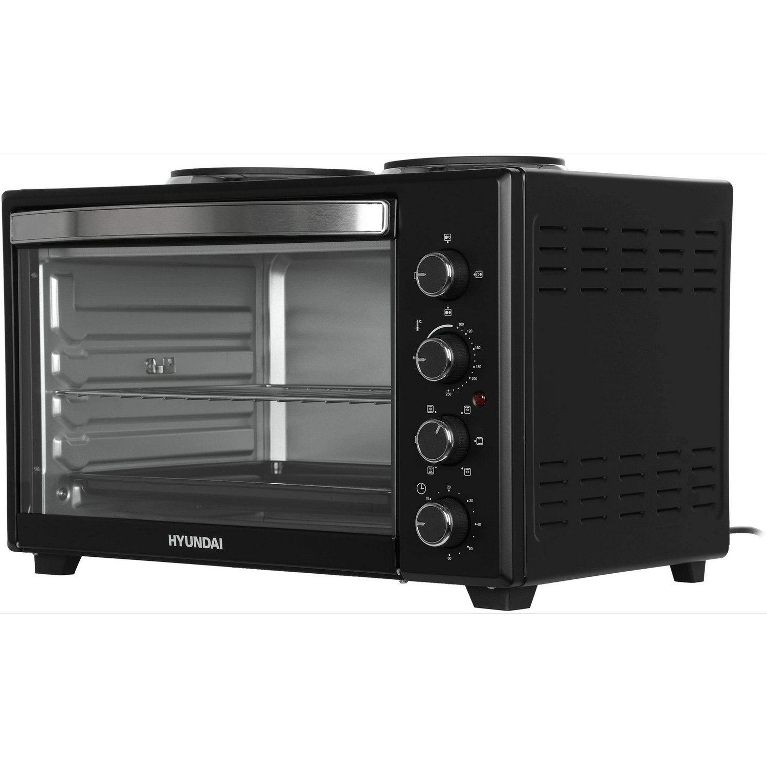 Модель Hyundai MIO-HY099 сочетает в себе функциональность электроплитки, гриля, электрической духовки и тостера. Пользуйтесь одновременно и двумя электрическими конфорками, и мини-печью, чтобы сделать сразу несколько блюд для всей семьи.
