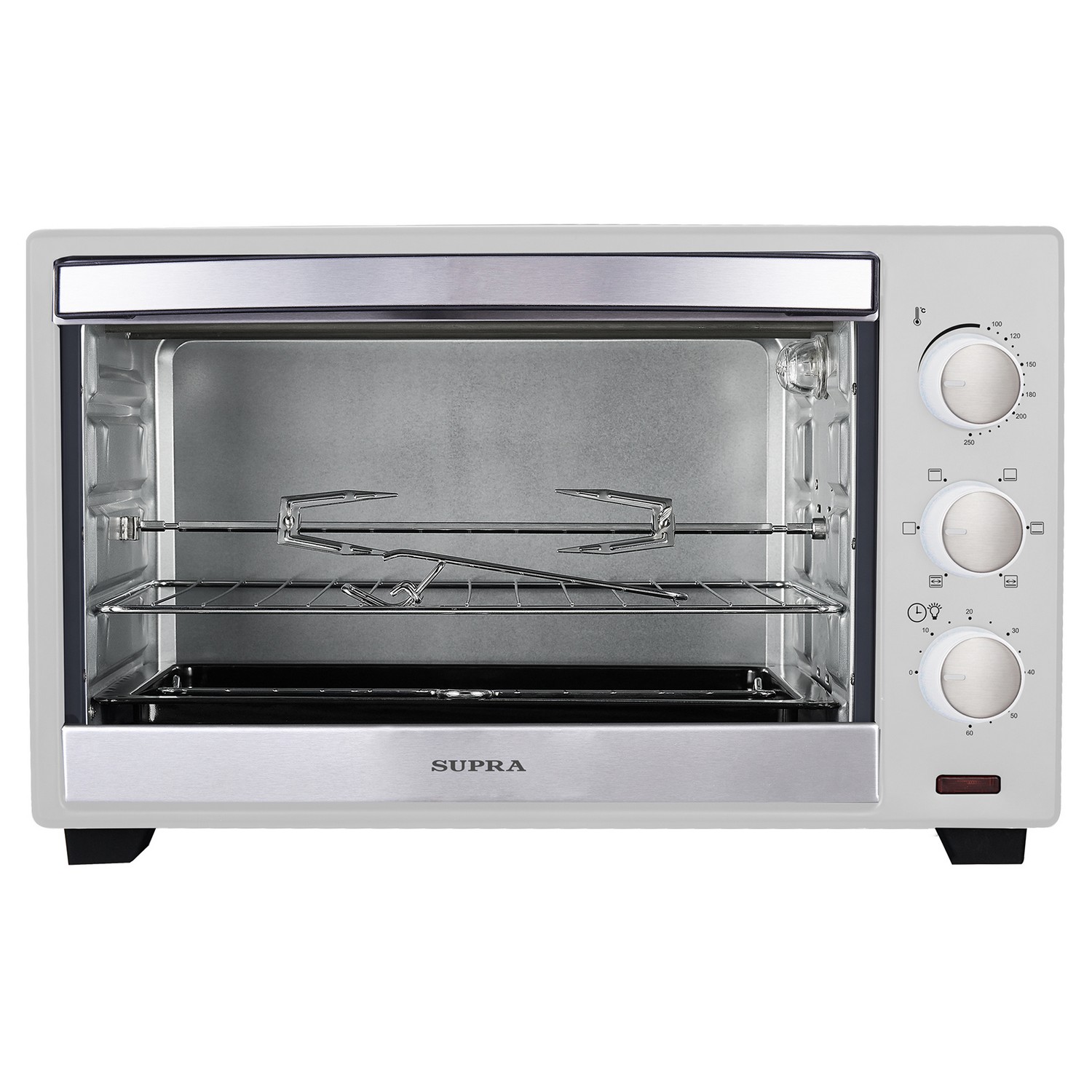 электропечь, металлическая решетка, плоский противень, круглая форма для пиццы, ухват для противня, вертел, ухват для вертела, инструкция на русском языке