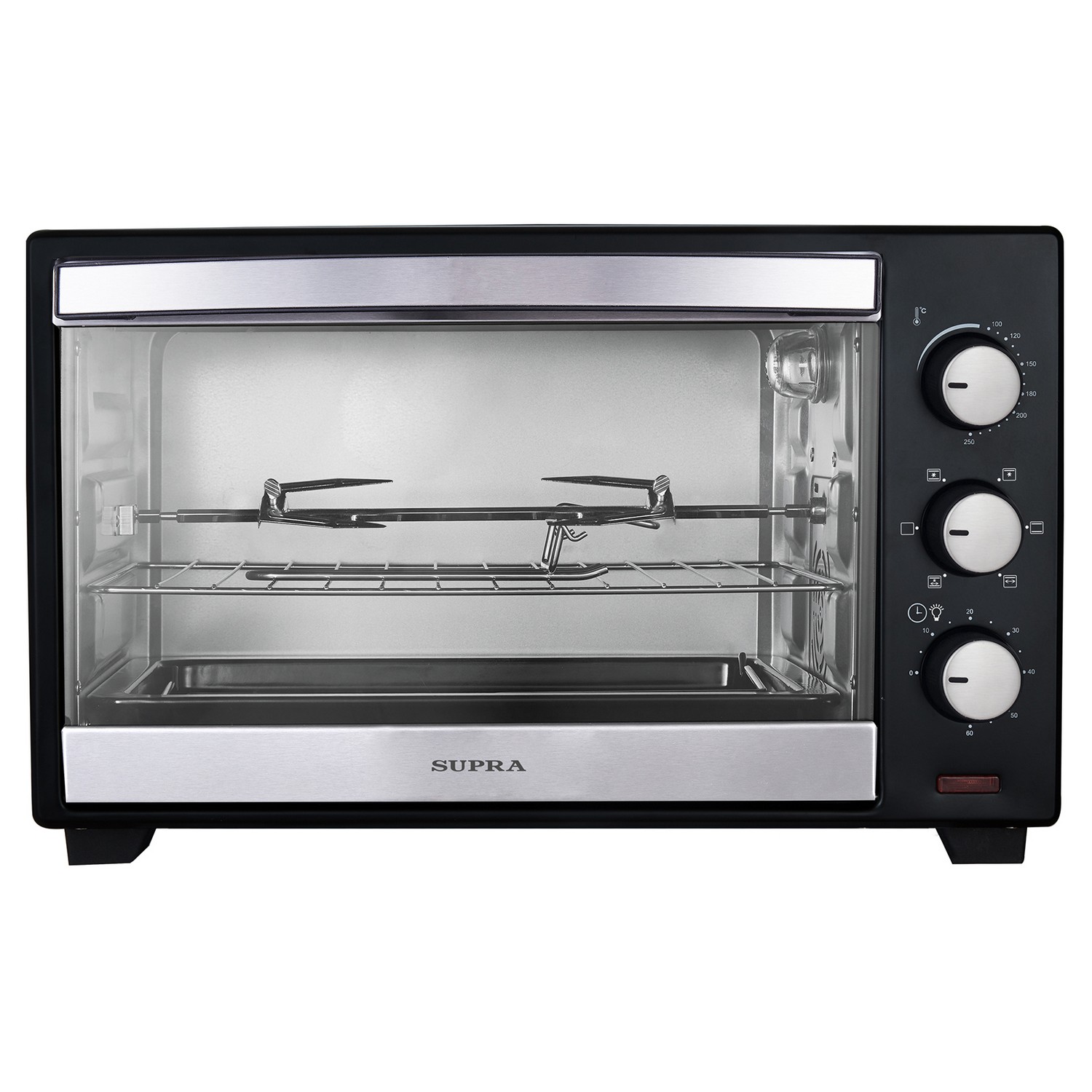 электропечь, металлическая решетка, плоский противень, насадка для шашлыка/кебаба, ухват для противня, вертел, ухват для вертела, инструкция на русском языке
