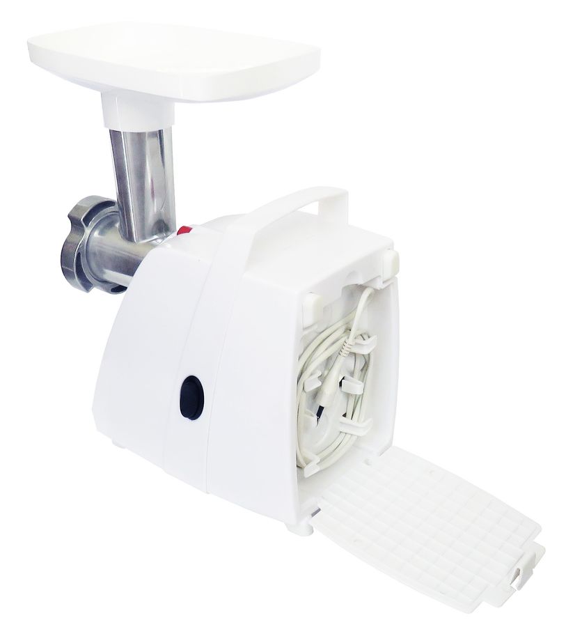 мощность 1500Вт, производительность 1.6кг/мин; количество скоростей 1; защита от перегрева; насадка для колбас; насадка для кеббе; насадка для соков; материал лотка пластик; цвет белый