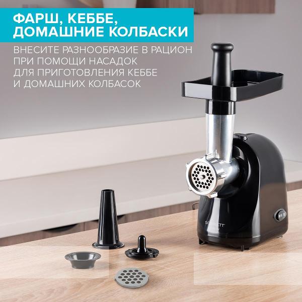 Мясорубка Scarlett SC-MG45M26 оптимальна для измельчения продуктов: мяса, рыбы, овощей. Реверс используется для извлечения застрявших кусочков. Для активации режима на корпусе имеется специальный переключатель. Производительность устройства мощностью 1900 Вт равна 2 кг/мин. В комплекте поставляются решетка, терка, кебе, овощерезка, шинковка, насадка для приготовления колбасы. Для предотвращения перегрева мотора модель отключается автоматически. С помощью толкателя обеспечивается безопасная загрузка продуктов.