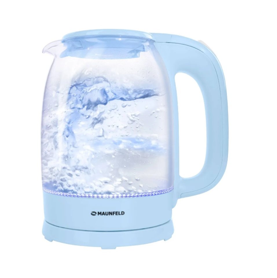 При включении загорается синяя подсветка, которая красиво подсвечивает кипящую воду и является индикатором включения чайника.