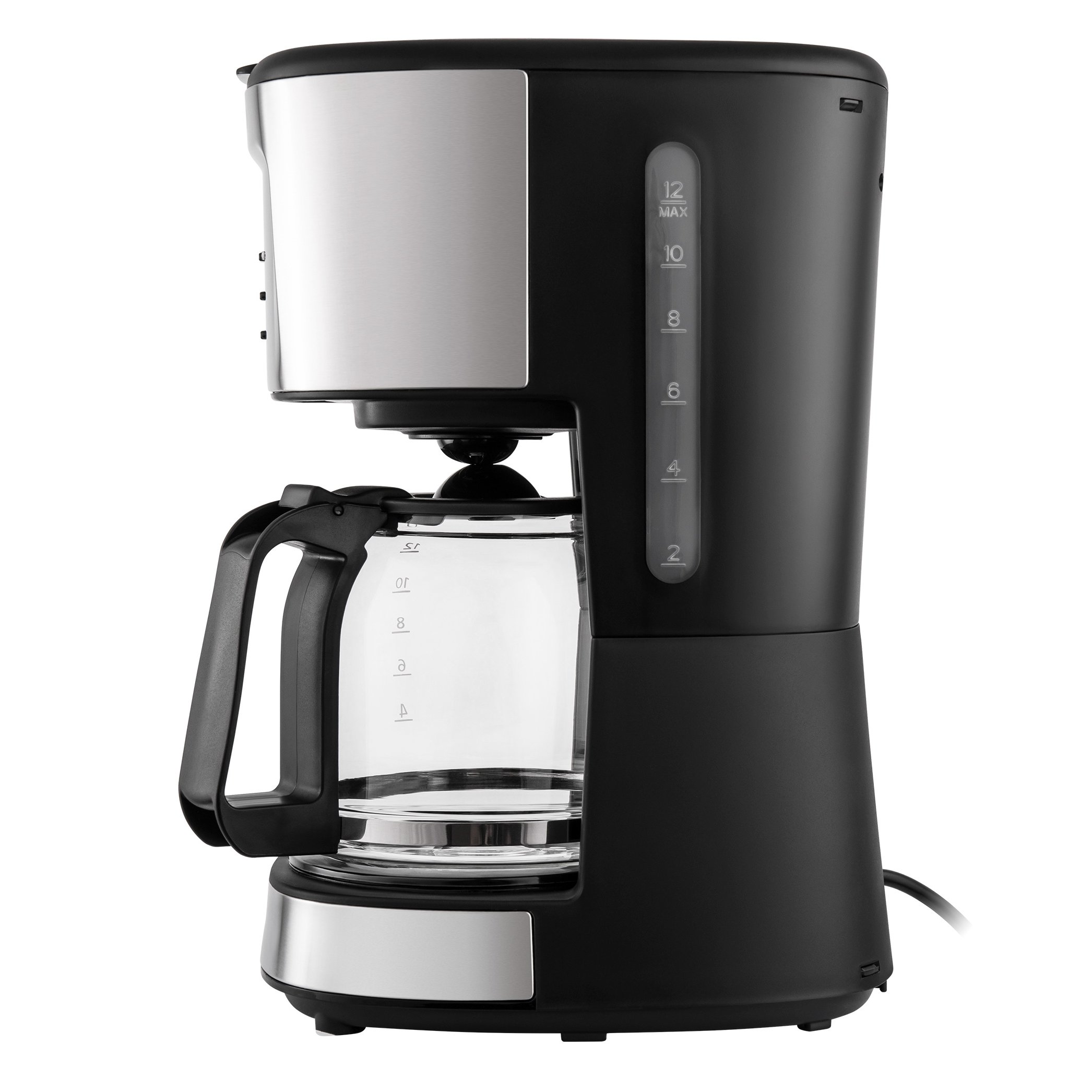 вращающийся фильтродержатель, индикатор уровня воды, индикатор включения, плита автоподогрева, дисплей