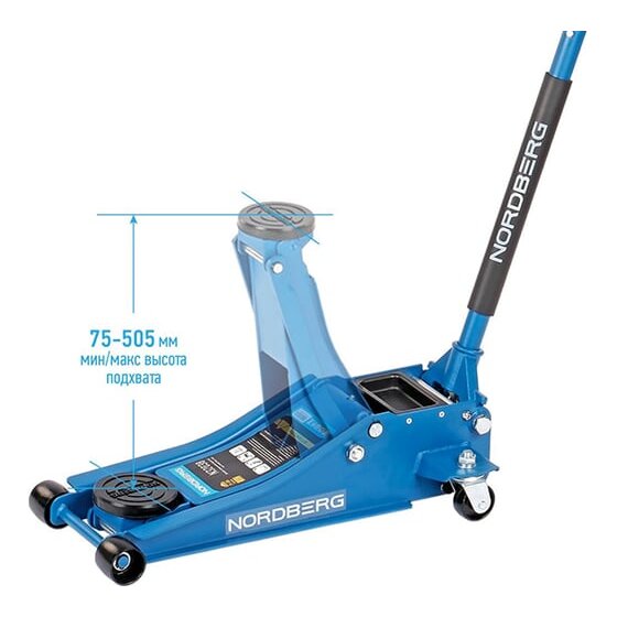 НАЗНАЧЕНИЕ Домкрат с низким подхватом подкатной 3 тонн, H=75-505 мм NORDBERG N32038 – Для профессионального использования в автосервисах и шиномонтажных мастерских.